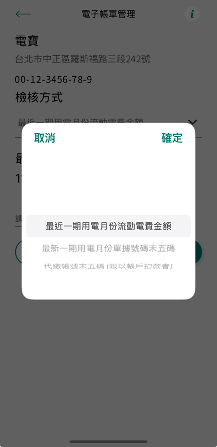 由台灣電力APP申請電子帳單,會即時同步至本公司電子帳單系統。為維護電費發票兌獎權益,針對無統編之電號僅限由一個帳號申請電子帳單,除用電戶名本人申請外,倘該電號已由他人先申請,則無法再申請電子帳單,並為保障用戶本人使用權益,如申請人非用戶本人(屬未認證者),需選擇驗證方式(三選一),通過檢核方可申請電子帳單。