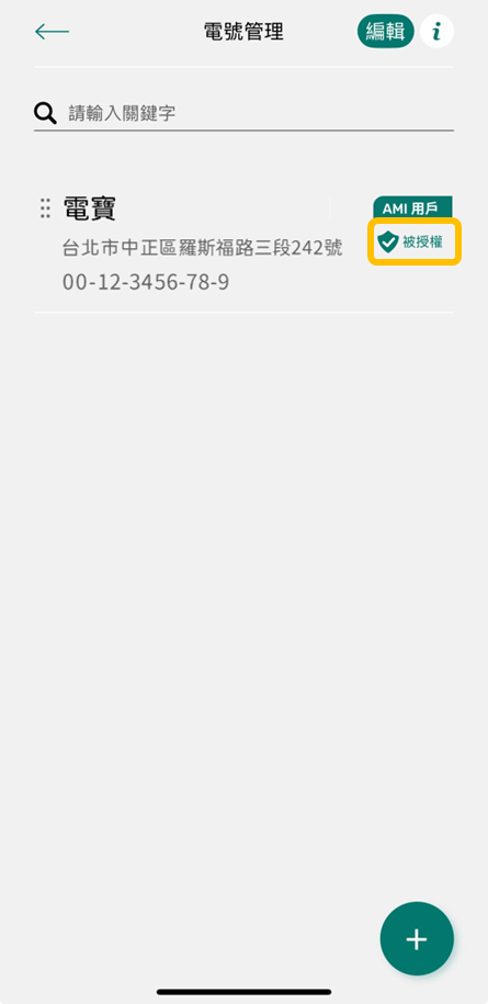 綁定電號 1 按下「快捷功能圓盤」 2 按下「電號管理」 3 輸入電號、用電戶名等資訊,也可掃描電費帳單上之行動支付掃描繳費QR碼進行新增 4-1 電號新增成功(用電戶名本人) 4-2 電號新增成功(非用電戶名本人) 5電號新增成功後,亦可點擊「編輯」功能,進行刪除電號 6 可選擇「全部刪除」或勾選電號後並按下「刪除」,亦可點擊取消功能即可停止編輯 認證電號 1 按下「快捷功能圓盤」 2 按下「電號管理」 3 選擇欲認證之電號,並點擊「我要認證」 4 請依提示內容顯示相關作業,以利符合認證條件 共享電號 1 按下「快捷功能圓盤」 2 按下「電號管理」 3 點選欲共享之已認證電號 4 按下電號共享 5 輸入欲共享電號之會員帳號或移除已共享之會員名單 6 新增分享後,共享之會員獲得查看等同該電號認證之相同資訊