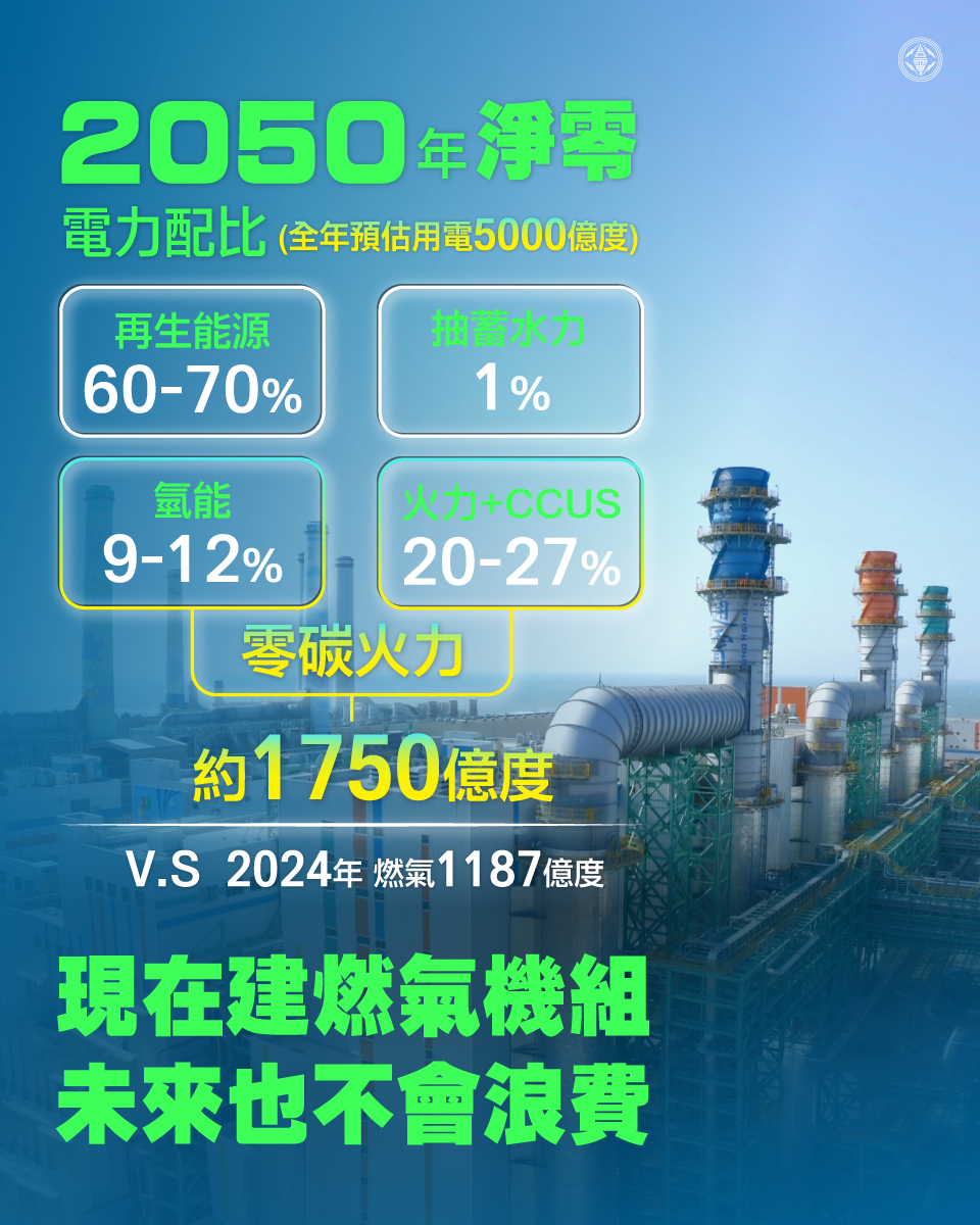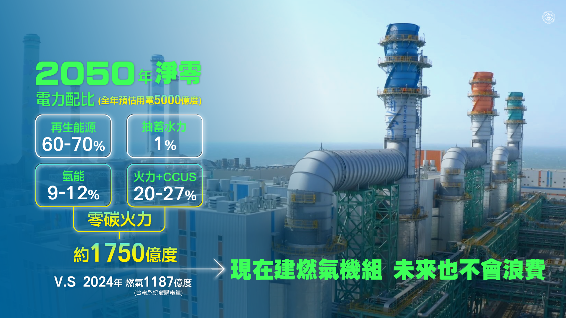 事實上台電公司已經跟日本的三菱、德國的西門子公司,在進行混氨或混氫的減碳技術合作,來降低火力發電的碳排量,這些都是在為淨零碳排作準備,所以現在我們建燃氣機組,未來也不會浪費。